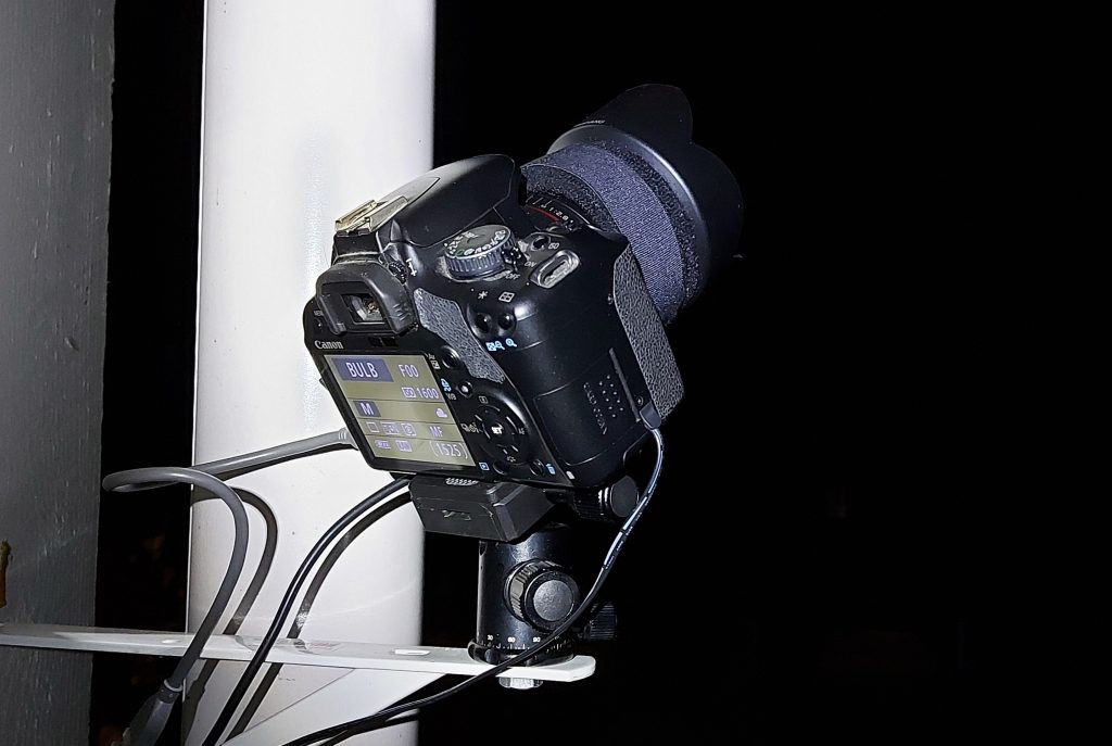 Koska valotusaika on noin pitkä, ei kuvaamista voi tehdä käsivaralla. Minulla on seinään kiinnitettynä tuo kuvassa näkyvä kulmarauta, jossa on kiinni jalustoissa käytettävä kuulapää. Näin minun ei tarvitse edes jalustan kanssa säätää, vaan kameran saa paikoilleen helposti ja nopeasti.