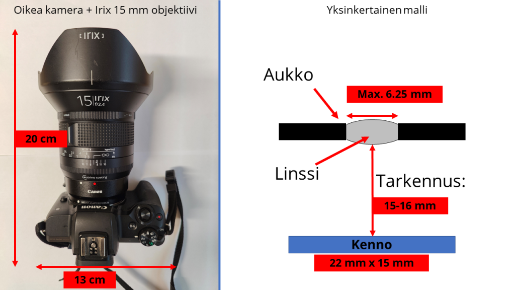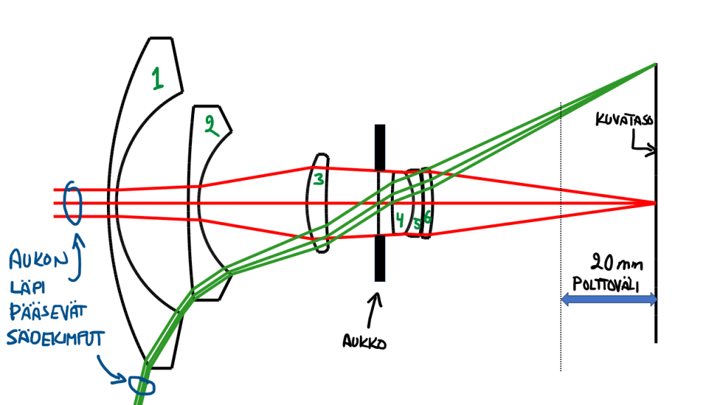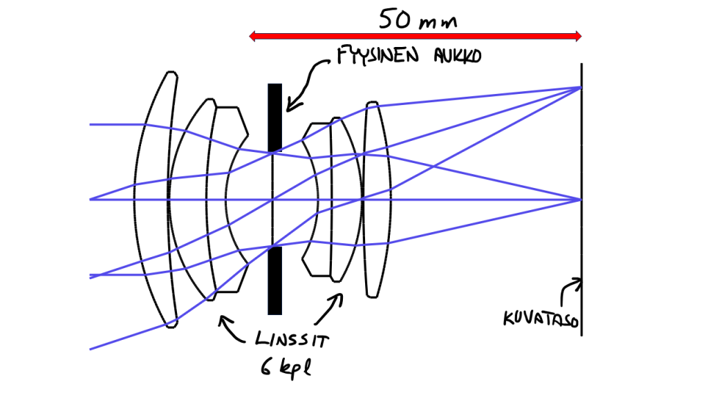 Jo ensimmäisessä osassa minulla oli piirrettynä objektiivin aukko yksinkertaistetussa objektiivin mallissa – silloin käytin samaa kuvaa, kun nyt alla oleva kuva1.