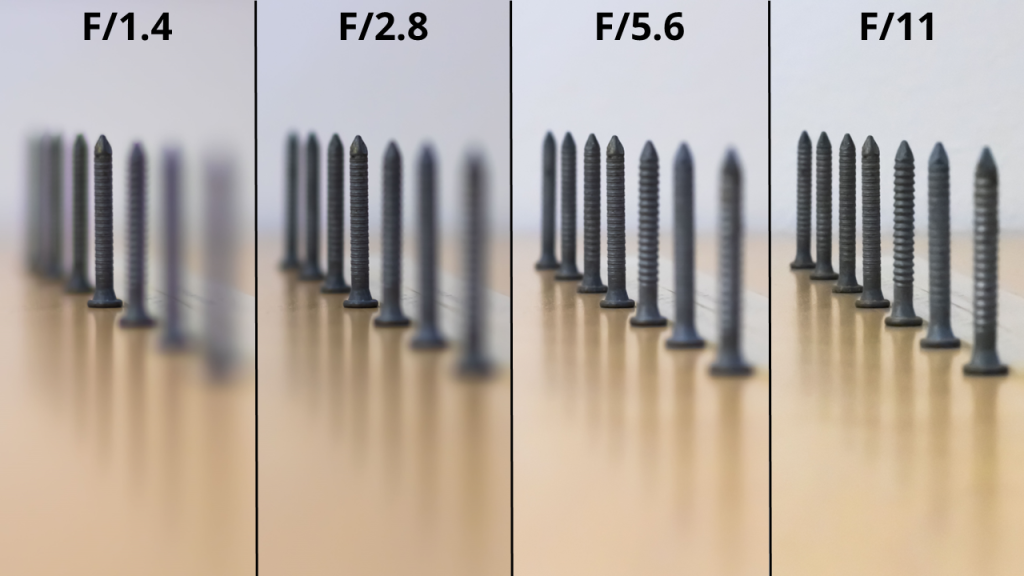 Kuvasta näkyy hyvin, miten suurella aukolla (pieni aukkoluku) ainoastaan keskimmäinen naula näkyy terävänä. Ja aukkoa pienennettäessä syvyysterävyys paranee. Syvyysterävyys tai taustan häivyttäminen sen avulla ovat valokuvauksessa hyvin usein käytettyjä tehokeinoja. Tässä yhteydessä kannattaa muistaa, että pienempi aukko tarkoittaa vähemmän valoa. Jolloin aukkoluvun kasvattaminen vaatii samalla valotusajan pidentämisen, ellei halua kuvan muuttuvan pimeämmäksi. Mutta tästä yhteydestä kerron myöhemmin toisessa artikkelissa.