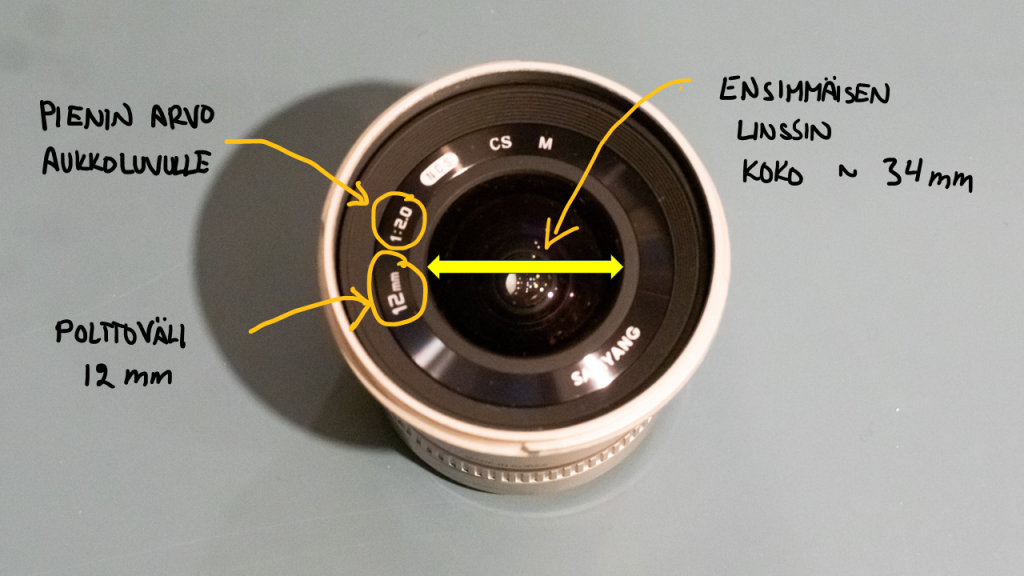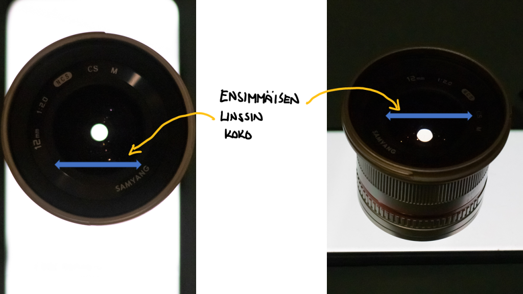 Tämä pieni kimppu suhteessa etummaisen linssin kokoon luonnollisesti tarkoittaa sitä, että aukko näyttä aika pieneltä suhteessa linssiin. Ja tätä demonstroin sitten yhdellä omistamallani laajakulmaisella 12 mm, $f/2$-aukkoisella Samyangin objektiivilla. Objektiivi näkyy kuvassa 12.