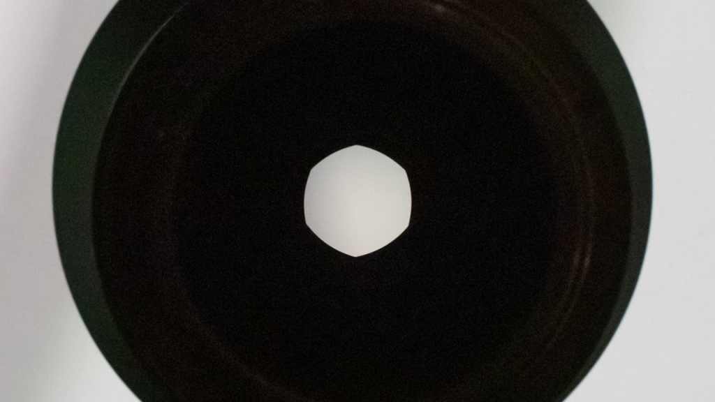 Samoin otin myös kuvan aukosta kameran kennon suunnasta katsottuna, ja se on kuvassa 14. Täältä päin katsottuna aukko näkyy hiukan erilaisena. Ja itse asiassa tältä puolelta katsottuna näkyy hyvin myös kyseisen objektiivin aukon muoto, joka on hiukan pyöristynyt kuusikulmio.