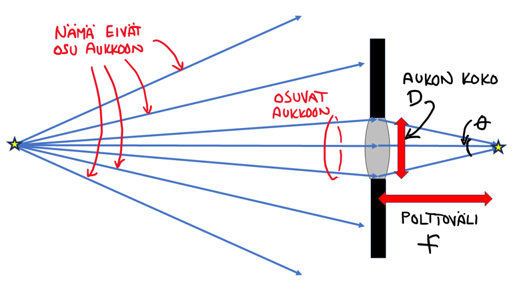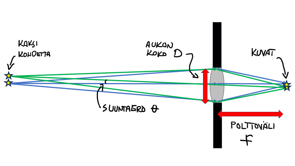 Kyse on siitä, että jos katsotaan tai kuvataan kahta pistemäistä lähdettä, kuten tähtiä taivaalla, niin on olemassa pienin mahdollinen suuntaero $\theta$, jolla kyseiset kohteet voidaan erottaa kuvassa vielä toisistaan. Ja siis sitä lähempänä toisistaan olevia kohteita ei voi kuvassa erottaa toisistaan, vaan ne näkyvät yhtenä valoläiskänä.