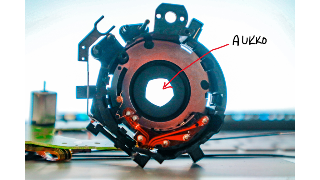 Kuvan komponentin olen purkanut yhdestä rikkomastani objektiivista. Sen rakenteen keskellä näkyy viisikulmainen aukko. Sen reunat ovat itse asiassa lehdykkäisiä, joita pystyy liikuttamaan siten, että aukon koko joko pienenee tai suurenee. Suurimmillaan aukko voi olla mustia lehdykkäisiä ympäröivän kuparin värisen osan reiän suuruinen. Pienimmillään se voi olla hyvinkin pieni.