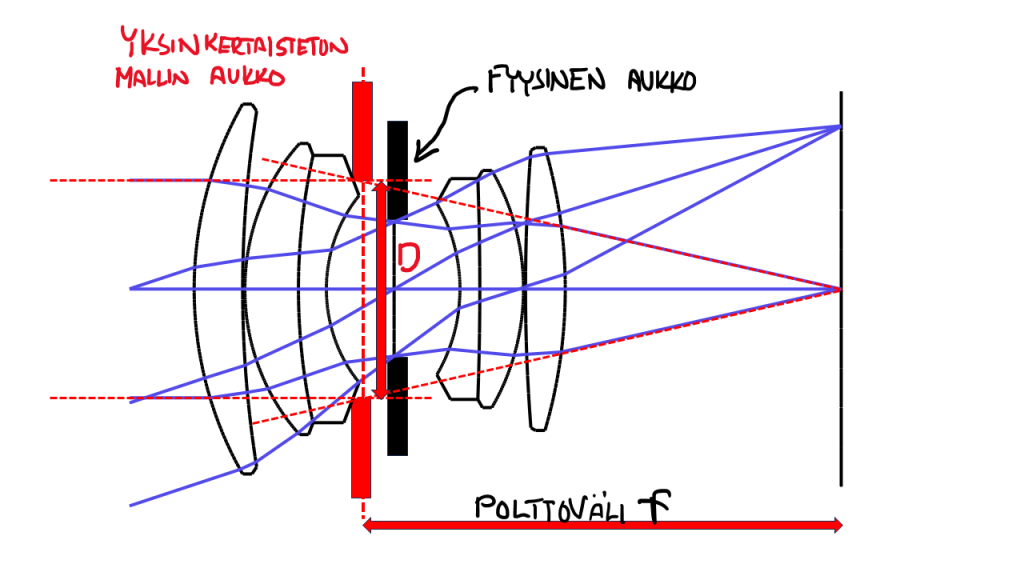 Tämä fyysisen aukon koko ei kuitenkaan ole ihan sama asia kuin aukkoluvussa käytetty aukon koko. Tätä olen hahmotellut kuvassa 6.