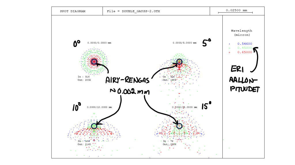 missä $x$ on kyseisen kuvapisteen läpimitta $\approx$ tarkoittaa, että on likimain yhtä suuri, $\lambda$ tarkoittaa tarkasteltavaa (yhtä) valon aallonpituutta, ja $\frac{f}{D}$ on tuo aiemmin mainitsemani aukkoluku. Tätä pisteen ideaalista kuvaa kutsutaan Airyn kuvioksi. Se on siis tietyn muotoinen valoläiskä, jonka läpimitta on likimain kyseinen $x$. Myöhemmin näytän muutaman simulointikuvan objektiiveista, ja niissä olen piirtänyt ”Airy-renkaan,” joka on rengas, jonka läpimitta on kyseinen $x$. Eli se kuvaa sitä, miten iso olisi ideaalisesti kyseinen pisteen kuva.