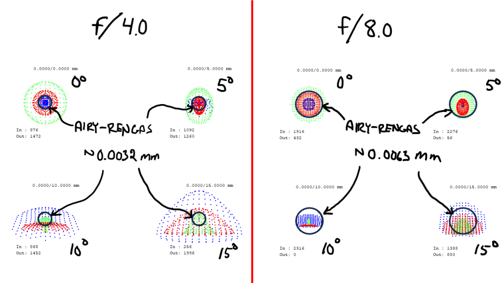 Kuhunkin kuvioon on merkitty myös aiemmin mainittu Airy-rengas. Eli se, minkä kokoinen olisi ideaalinen pisteen kuva. Tämä saavutetaan silloin, jos jokainen objektiivin läpi kulkenut säde osuisi täsmälleen kuvion keskipisteeseen.