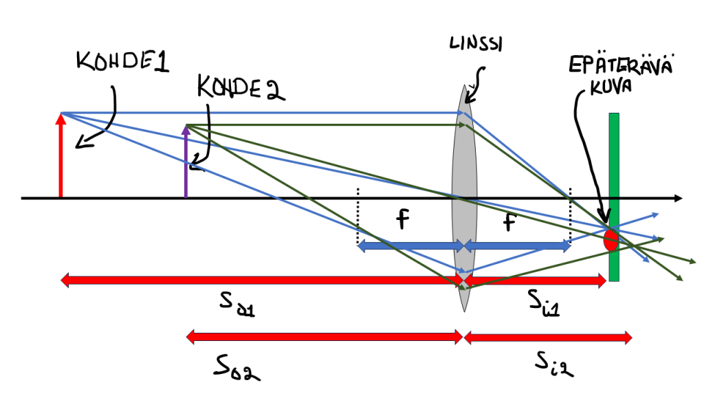 Kun kuvassa oleva kohde 1 on tarkka kuvatasossa – siis kameran kennolla – niin kohteen 2 kuva muodostuukin eri etäisyydelle. Tämän esimerkkikuvan tapauksessa, kohteen 2 kuva olisi terävä hiukan kauempana. Käyttäen ohuen linssin kuvausyhtälöä ja hiukan geometriaa, voi analysoida sitä, kuinka suurelle alueelle osuvat kohteesta 2 tulevat säteet. Tätä esittää kuvassa tuo punainen soikio. Ja helposti näkee, että tuon soikion koko kasvaa, kun linssin aukon kokoa kasvatetaan. Ja myös sen, että soikio on toisaalta sitä pienempi, mitä lähempänä kohde 2 on kohdetta 1. Tätä kutsutaan syvyysterävyydeksi.